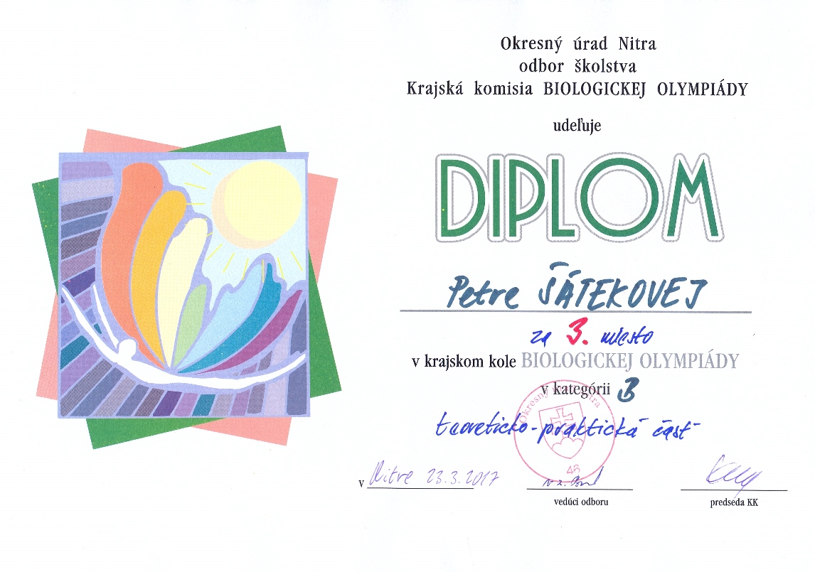 Dňa 23. marca 2017 sa v Nitre konalo krajské kolo biologickej olympiády. Naša žiačka Petra Šáteková (I.A) získala krásne 3. miesto! Úspešným riešiteľom sa stal aj Daniel Osuský (II.A).