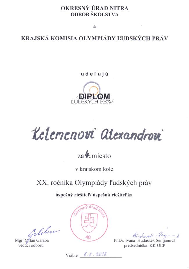 V súťaži bilingválnych španielskych gymnázií organizovanej pod záštitou Veľvyslanectva Španielskeho kráľovstva CONCURSO INTERNACIONAL DE FOTOMONTAJE 2018 získal náš žiak Tobiáš Ondruš (II.D) krásne 3. miesto. So svojou fotomontážou pod názvom "La historia de España llena el vaso de los derechos humanos" postupuje do medzinárodného kola!
